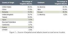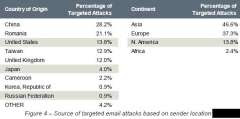 (1)emailに添付されたマルウェアのサーバipソース情報を見るとアメリカメールサーバから36.6%、次は中国(17.8%)とルーマニア(16.5%)です。